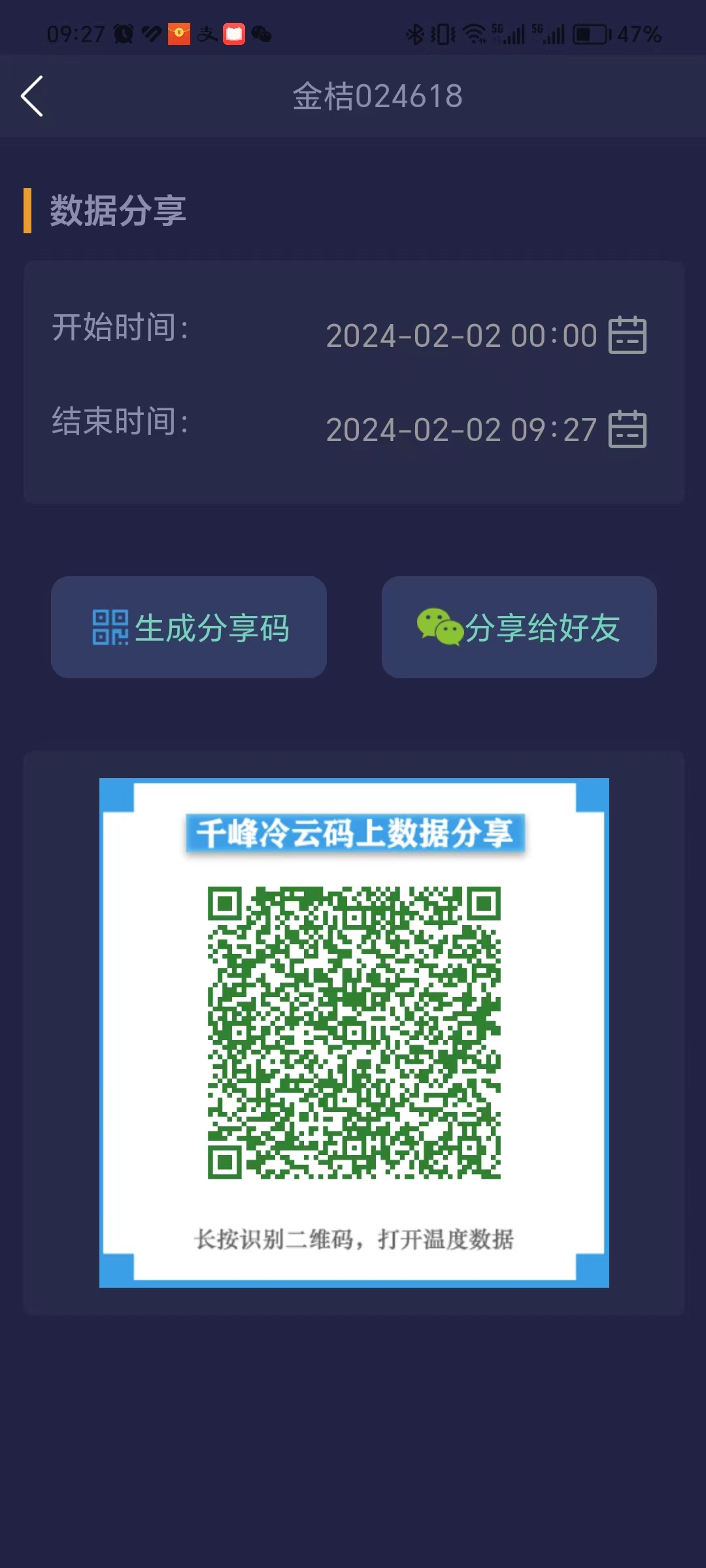 【碼上分享】:支持車主生成某時段溫度數(shù)據(jù)的二維碼,分享給貨主,貨主掃碼后可貨物運送期間的制冷信息;